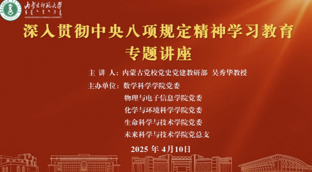 我院联合数学科学学院、物理与电子信息学院、生命科学与技术学院和未来科学与技术学院共同举办深入贯彻中央八项规定精神学习教育专题讲座2025-04-10开展深入贯彻中央八项规定精神学习教育,是巩固深化主题教育和党纪学习教育成果、纵深推进全面从严治党的重要举措。为深入贯彻落实党中央、自治区党委、学校党委深入贯彻中央八项规定精神学习教育精神和要求,高质量开展学习教育活动,4月10日,我院联合数学科学学院、物理与电子信息学院、生命科学与技术学院和未来科学与技术学院在赛罕校区行政楼三楼报告厅举办深入贯彻中央八项规定精神学习教育读书班专题讲座。讲座邀请内蒙古党校党史党建教研部吴秀华教授作题为“... -