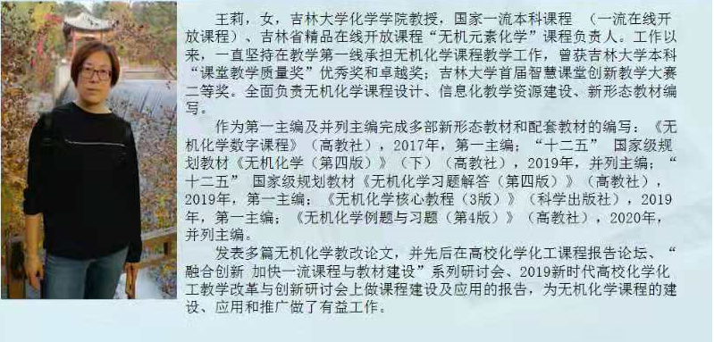 2021年4月22日下午,吉林大学化学学院王莉教授应yL23411永利集团邀请,在线上(腾讯视频会议)做了关于“无机化学在线课程建设与线上线下混合式教学实践”的专题讲座。我院院长贾美林教授主持会议,学院师生在化学楼102会议室集体参加了此次学术报告。