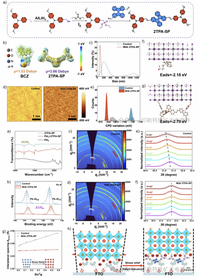 2、多功能界面调控:甲氧基与Pb²⁺配位钝化缺陷,三苯胺单元增强空穴提取,同时缓解钙钛矿薄膜残余应力,提升结晶质量。