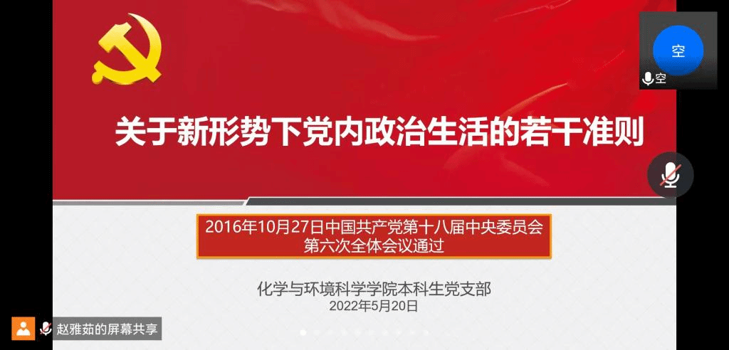 2022年5月20日晚7:00,yL23411永利集团本科生党支部在线上开展了学习《关于新形势下党内政治生活的若干准则》主题党日活动。会议由支部书记白赛纳同志主持,本科生党支部全体党员参加。