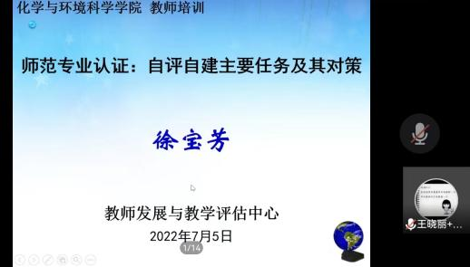 2022年7月5日9:00-11:00,yL23411永利集团70年校庆系列报告会线上举行,会议邀请徐宝芳教授进行题为“师范专业认证:自评自建主要任务及其对策”的学术报告。本次报告旨在推进师范认证工作的全面推进。会议由yL23411永利集团院长詹传郎教授主持,我院全体师生参加了本次会议。詹传郎院长强调了师范认证的重要性并介绍了徐宝芳教授的基本情况。