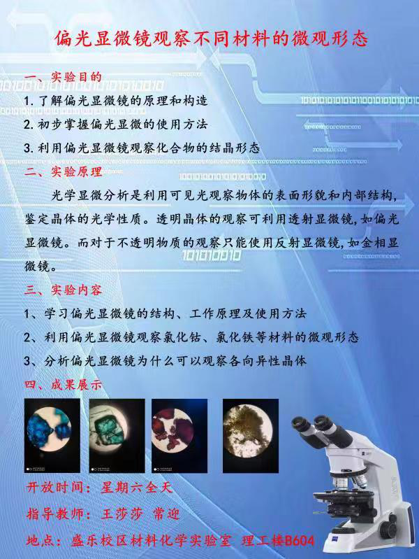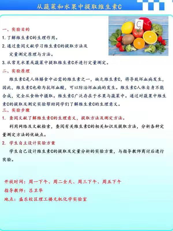 学院“开放实验”是一项结合学院特色,实现学生全天自主实验,全方位提高学生自主创新、独立思考能力的活动。每个项目参加学生人数为4人,每一组学生只能选一个实验,每组利用“排课选课”小程序,有教师建立课程,小组组长选课的方式进行。“开放实验”指导老师制作宣传海报,学生根据自身兴趣自主选课。每个项目的负责人结合开放实验内容及实验室条件、专业特点及学生的实际情况,按照因材施教的原则,指定科学合理的实施方案,使学生经历一个相对较完整的科研过程,每个环节须对学生提出明确的要求,并在规定时间完成。