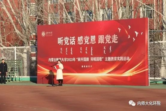 升旗完毕后,由数学科学学院代表进行国旗下发言。过去的2022年注定是不平凡的一年,我们共克时艰,迎来了曙光。网课期间,我们看到了老师们的辛勤付出,也看到了同学们刻苦学习的身影。在全体内师人的共同努力下,学校取得多项成绩与成就。展望2023,希望全体学子继续发扬献身求实团结奋进的校训,奋进当下,在新学期的航线上扬帆起航。