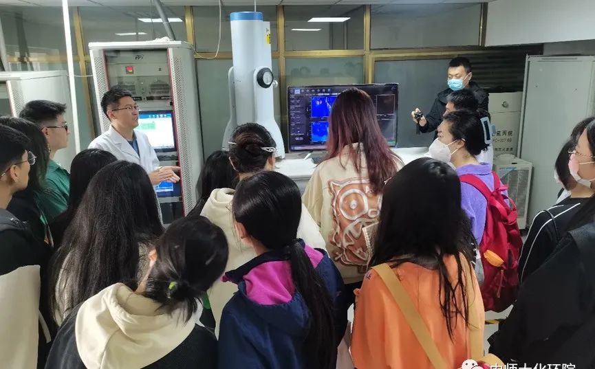 在大气环境超级站,周兴军高级工程师和郝峰工程师等带领师生们参观了多参数综合观测实验室、温室气体和沙尘观测实验室、气溶胶和光化学观测实验室。根据同学们在校期间所学专业课与大家进行交流,针对近期沙尘天气频繁出现的原因、过程、数据峰值给同学们进行了讲解。