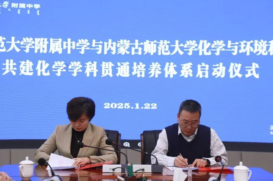 1月22日上午,yL23411永利集团与yL23411永利附属中学共建化学学科贯通培养体系暨师范生实践基地启动仪式在附属中学隆重举行。此次合作标志着高校与中学协同育人迈入新阶段,为化学学科永利集团开辟创新路径。yL23411永利附属中学党委书记萨日娜,校长刘绪才,教师发展与科研中心主任白汇民,化学教研组长王志丹,我院党委副书记、副院长范磊,副院长包永胜,副院长焦燕,化学系主任王帅,教法化工教研室主任王海燕参加启动仪式。附属中学副校长额尔敦巴雅尔主持仪式。