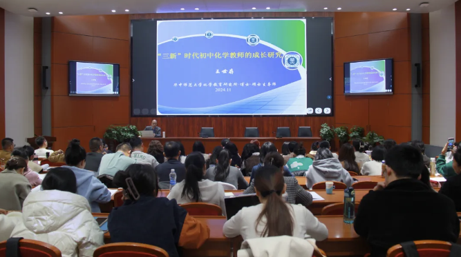 11月12日,华中师范大学基础教育高质量发展研究院执行院长王世存应邀来我校开展题为“基于新课标理念的初中化学核心观念教学设计与评价研究”和“三新时代卓越初中化学教师的成长研究”的讲座。国培计划(2024)初中化学优秀教师与我院研究生共同聆听了讲座。讲座由学科教学(化学)专业学位点负责人李玉珍教授主持。