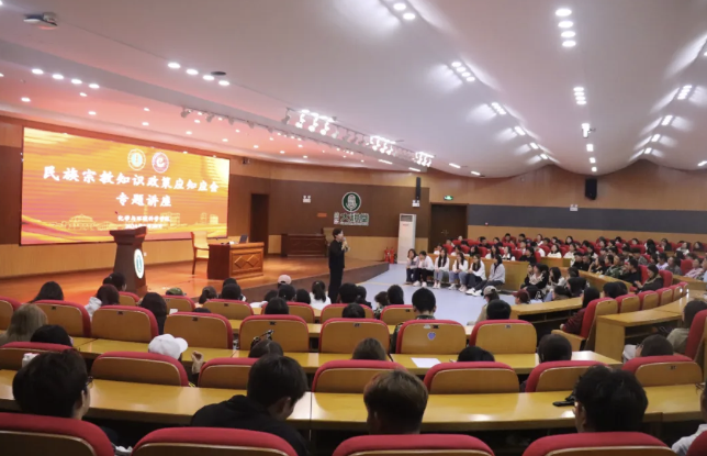 传民族政策,启宗教正知2024-09-21为深入贯彻落实党的二十大精神以及习近平总书记关于宗教工作的重要论述,教育引导青年学生树立科学的世界观、人生观和价值观,提高同学们的民族团结意识和正确认识宗教的能力,9月20日下午,我院在图书馆一楼报告厅举办了“民族宗教知识政策应知应会专题讲座”。本次讲座由学院党委副书记、副院长范磊主讲,2024级全体新生参加讲座。在讲座中,范磊书记指出,民族宗教工作在党和国家工作全局中具有特殊重要性。各民族要相互了解... -