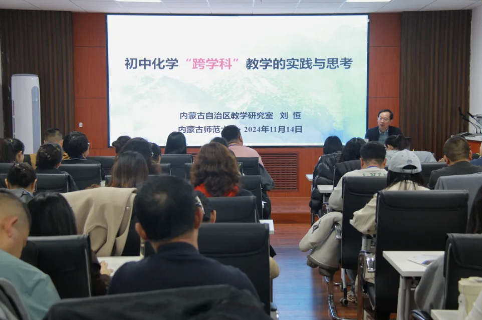 化学教育智慧交融,专业引领砥砺前行2024-11-15为助力教师在教学实践中更好地培养学生的化学核心素养,适应新时代对化学教育提出的新要求。11月14日,内蒙古自治区教学研究室体美劳教研部主任、中学化学教研员刘恒,我院学科教学(化学)及课程与教学论(化学)专业学位点负责人李玉珍教授作了前沿理念与实践经验的深度分享,国培计划(2024)的49名初中化学优秀教师聆听了讲座。上午,刘恒老师作题为“初中化学跨学科教学的实践与思考”的讲座。活动伊始,刘恒老师巧妙设置... -